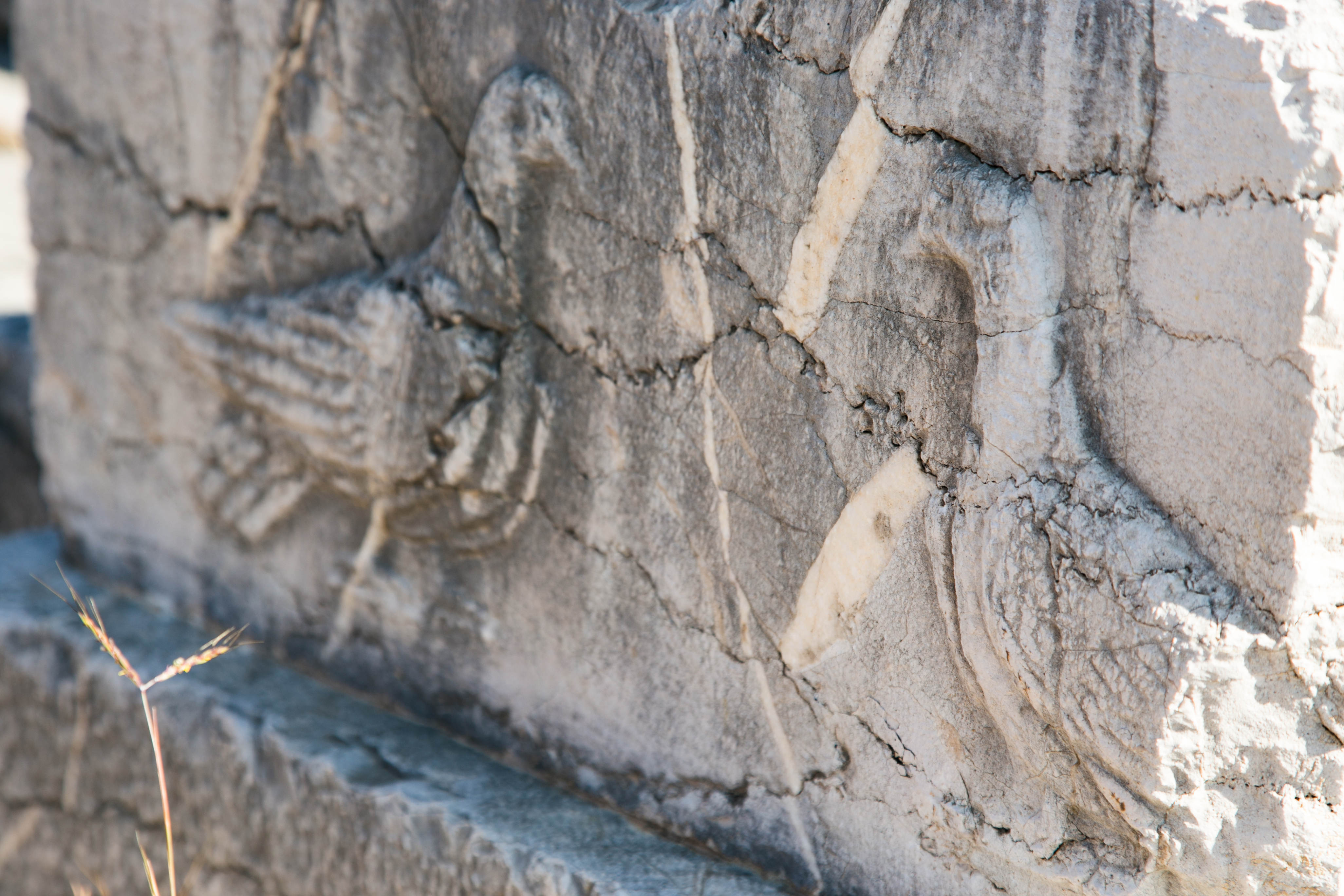 [2.17.6] Of the votive offerings [anathēmata] the following are worth speaking-about [logos]. There is an altar [bōmos] upon which is worked in relief the legendary [legomenon] wedding of Hēbē and Hēraklēs. This is of silver, but the peacock dedicated by the Emperor Hadrian is of gold and gleaming stones. He dedicated it because they hold the bird to be sacred to Hērā. Also deposited here are a golden garland [stephanos] and a purple robe [peplos], offerings [anathēmata] of Nero.
